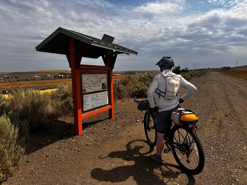 We are back to finish the XWA Mountain Bike Race Across Washington route! Othello was quickly put behind us. Right outside of town we were buzzed by a crop duster- pretty cool. We traveled on gravel roads through fields to Malden, then caught the Palouse to Cascades Rail Trail. The terrain wasn’t too bad, gravel that was fairly packed so we could keep a good pace. We pedaled into Lind and stopped at Jim’s Market for.bite to eat and take a break.