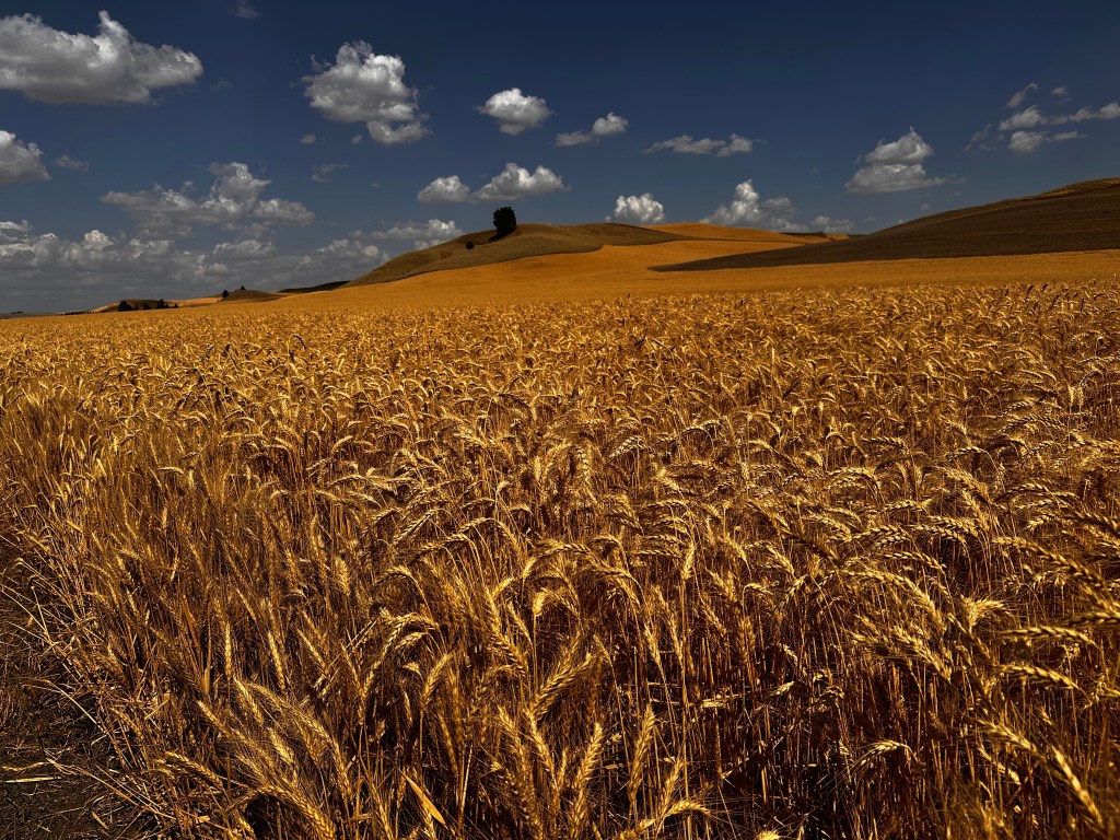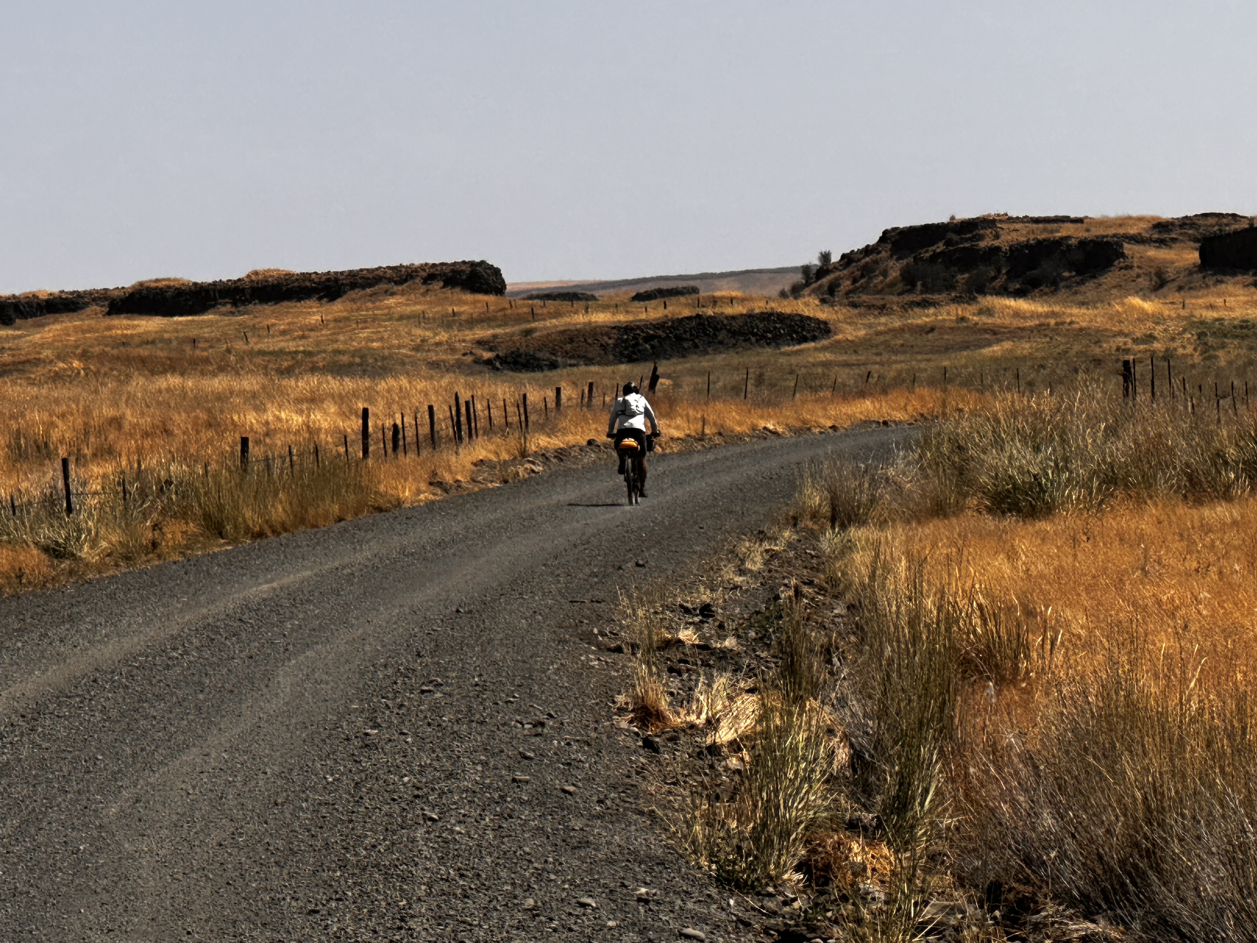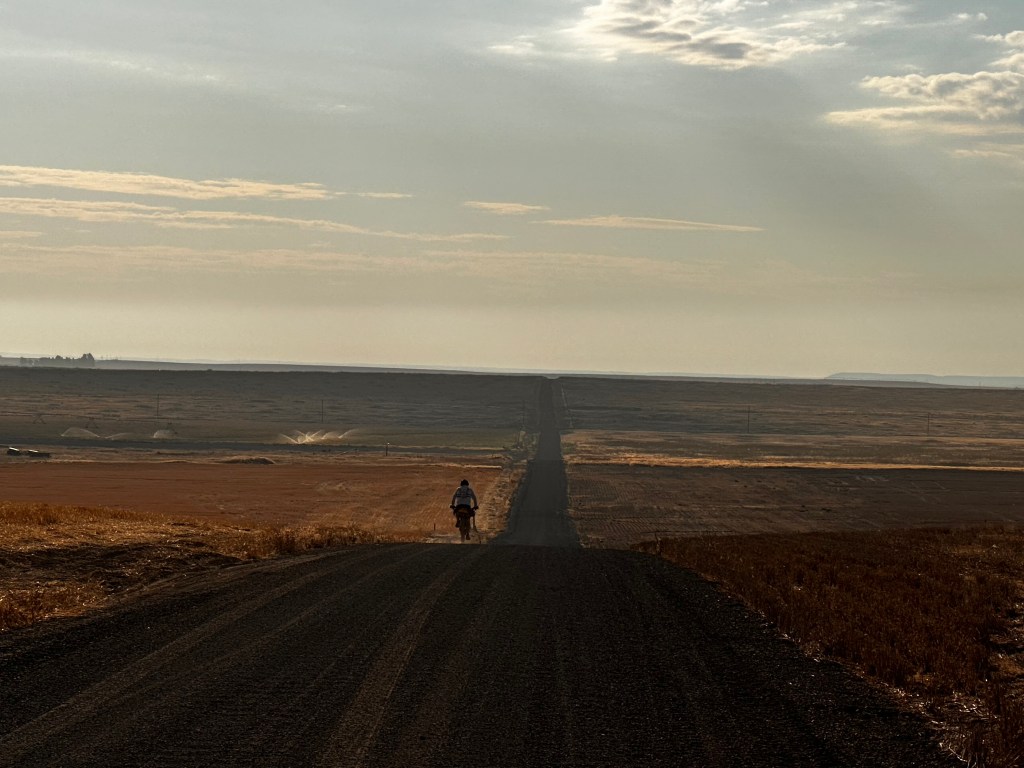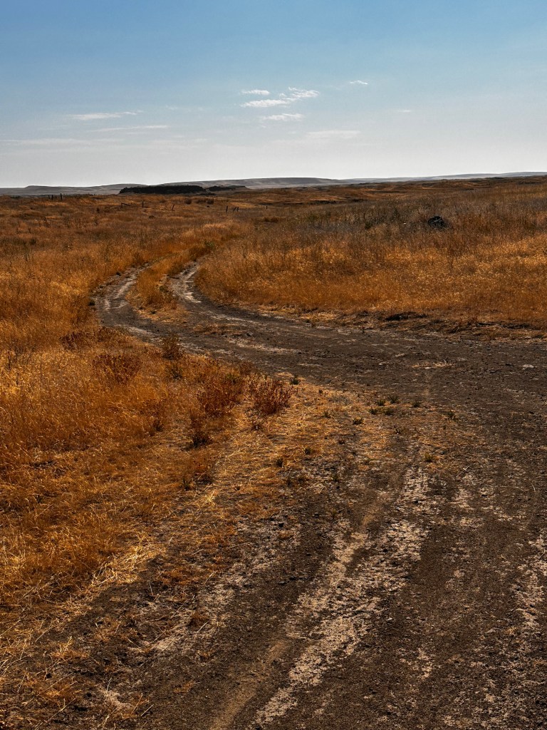 We left Ritzville about 7am after a Starbucks coffee and a big breakfast. Pedaling into the sun, we headed out on gravel farm roads through the rolling wheat fields. We turned toward the south east to pick up the Palouse to Cascades Trail again.